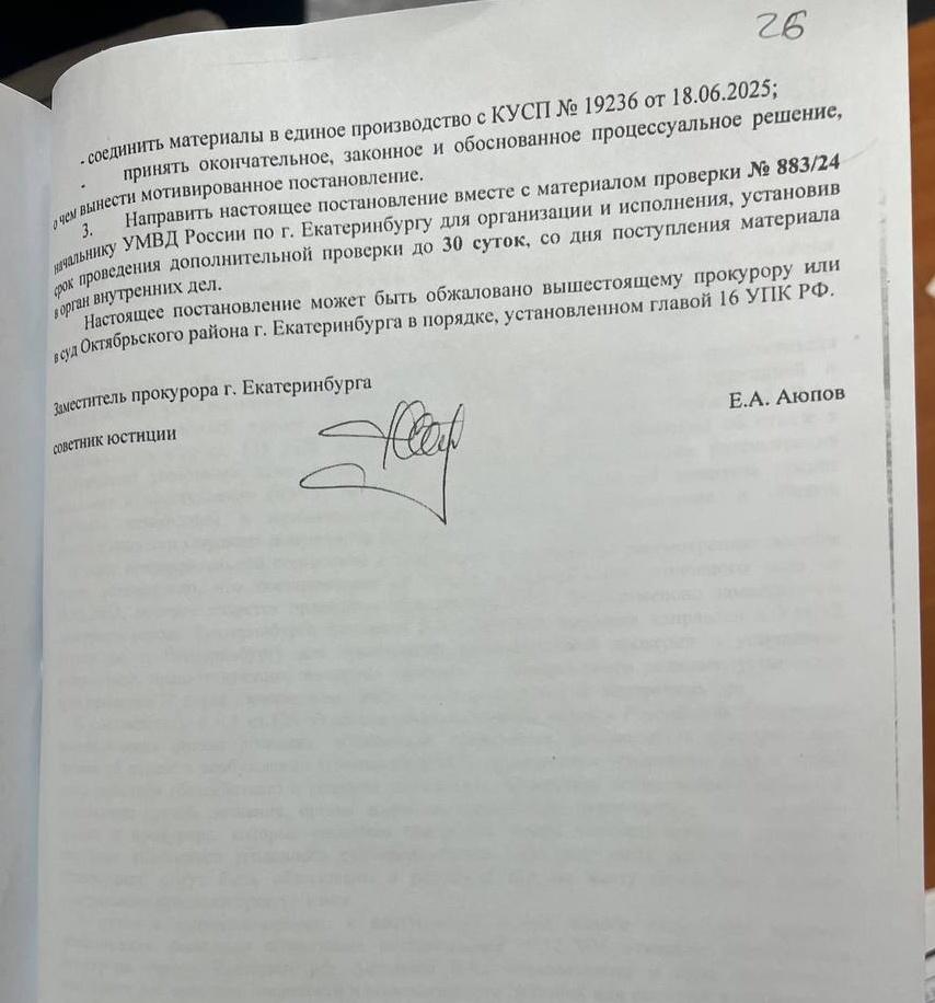 К сожалению, до этого еще не дошло и общественное Движение «ЗАКОНОПОСЛУШНЫЙ ГРАЖДАНИН» обращается в Прокуратуру Свердловской области для отмены незаконного отказного материала.