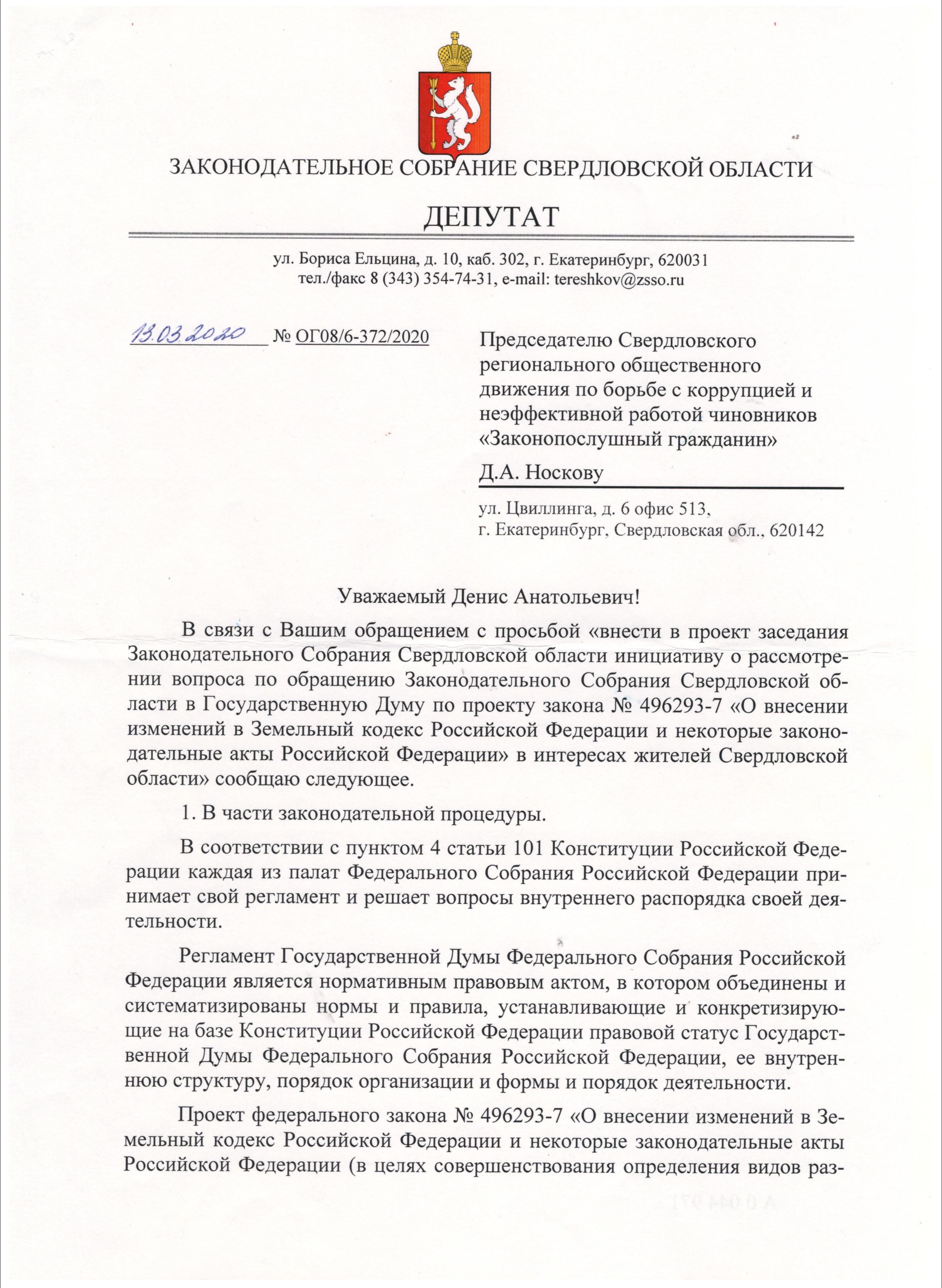 В адрес депутата Законодательного Собрания Свердловской области Терешкова В. А. направлено обращение, с просьбой внести в проект законодательного собрания Свердловской области инициативу о рассмотрении вопроса по обращению Законодательного Собрания Свердловской области в Государственную Думу по проекту закона №496293-7 «О внесении изменений в Земельный кодекс Российской Федерации и некоторые законодательные акты Российской Федерации» в интересах жителей Свердловской области.