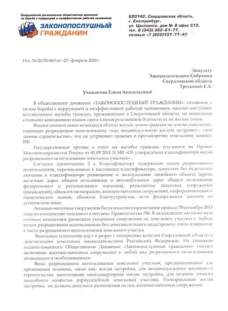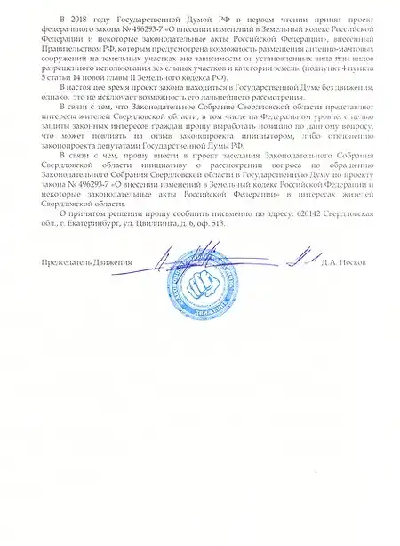 В адрес депутата Законодательного Собрания Свердловской области Тресковой Е. А. направлено обращение, с просьбой внести в проект законодательного собрания Свердловской области инициативу о рассмотрении вопроса по обращению Законодательного Собрания Свердловской области в Государственную Думу по проекту закона №496293-7 «О внесении изменений в Земельный кодекс Российской Федерации и некоторые законодательные акты Российской Федерации» в интересах жителей Свердловской области.