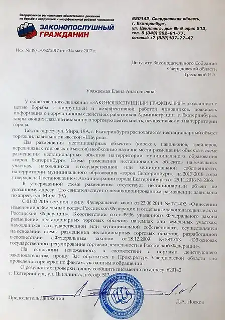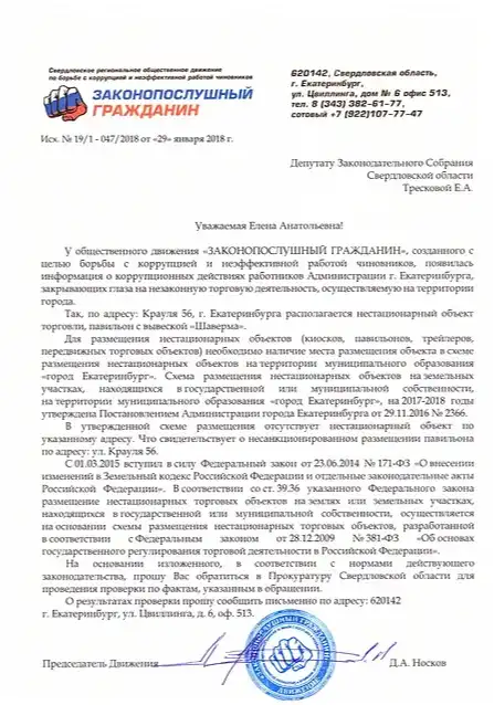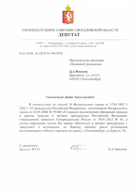 В адрес депутата Законодательного Собрания Свердловской области Тресковой Е. А. направлен запрос о незаконном размещении нестационарного объекта торговли с просьбой обратиться в областную прокуратуру.