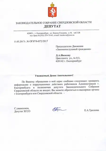 В ответ пришла отписка. В прокуратуру Свердловской области и иные органы депутат обращаться не стал.