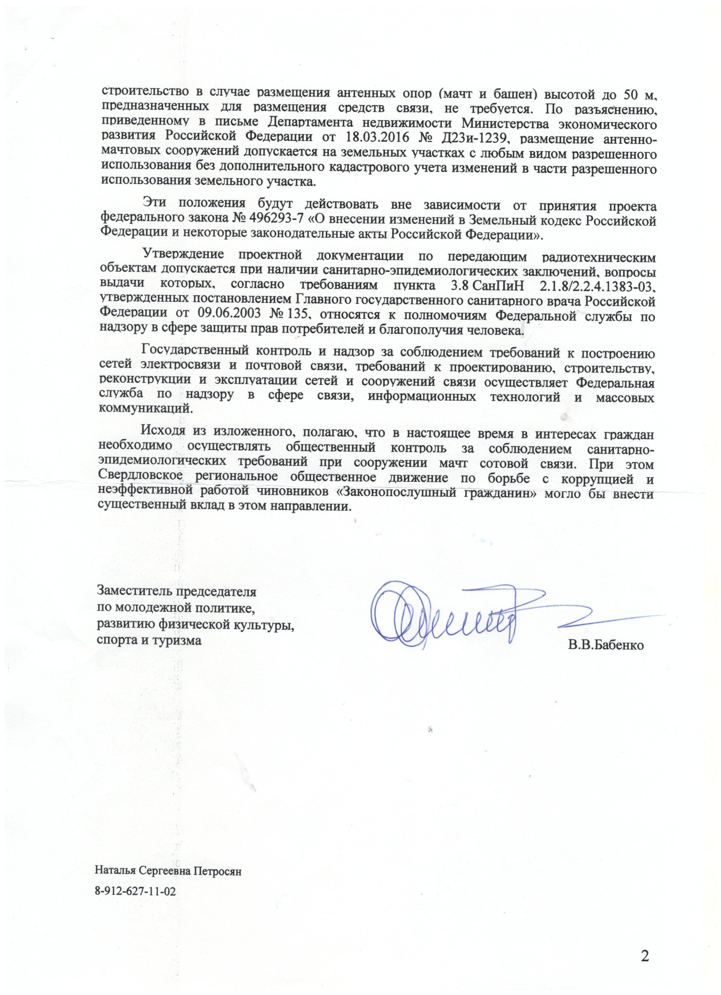 В адрес депутата Законодательного Собрания Свердловской области Бабенко В.В. направлено обращение, с просьбой внести в проект законодательного собрания Свердловской области инициативу о рассмотрении вопроса по обращению Законодательного Собрания Свердловской области в Государственную Думу по проекту закона №496293-7 «О внесении изменений в Земельный кодекс Российской Федерации и некоторые законодательные акты Российской Федерации» в интересах жителей Свердловской области.
