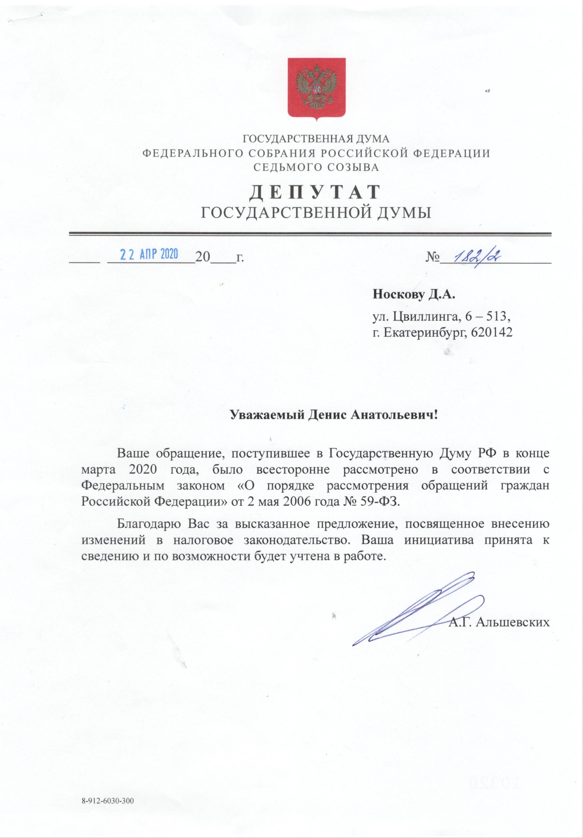 В адрес депутата Государственной думы РФ Альшевских А.Г. направлен запрос о незаконном размещении нестационарных объектов торговли с просьбой обратиться в областную прокуратуру.