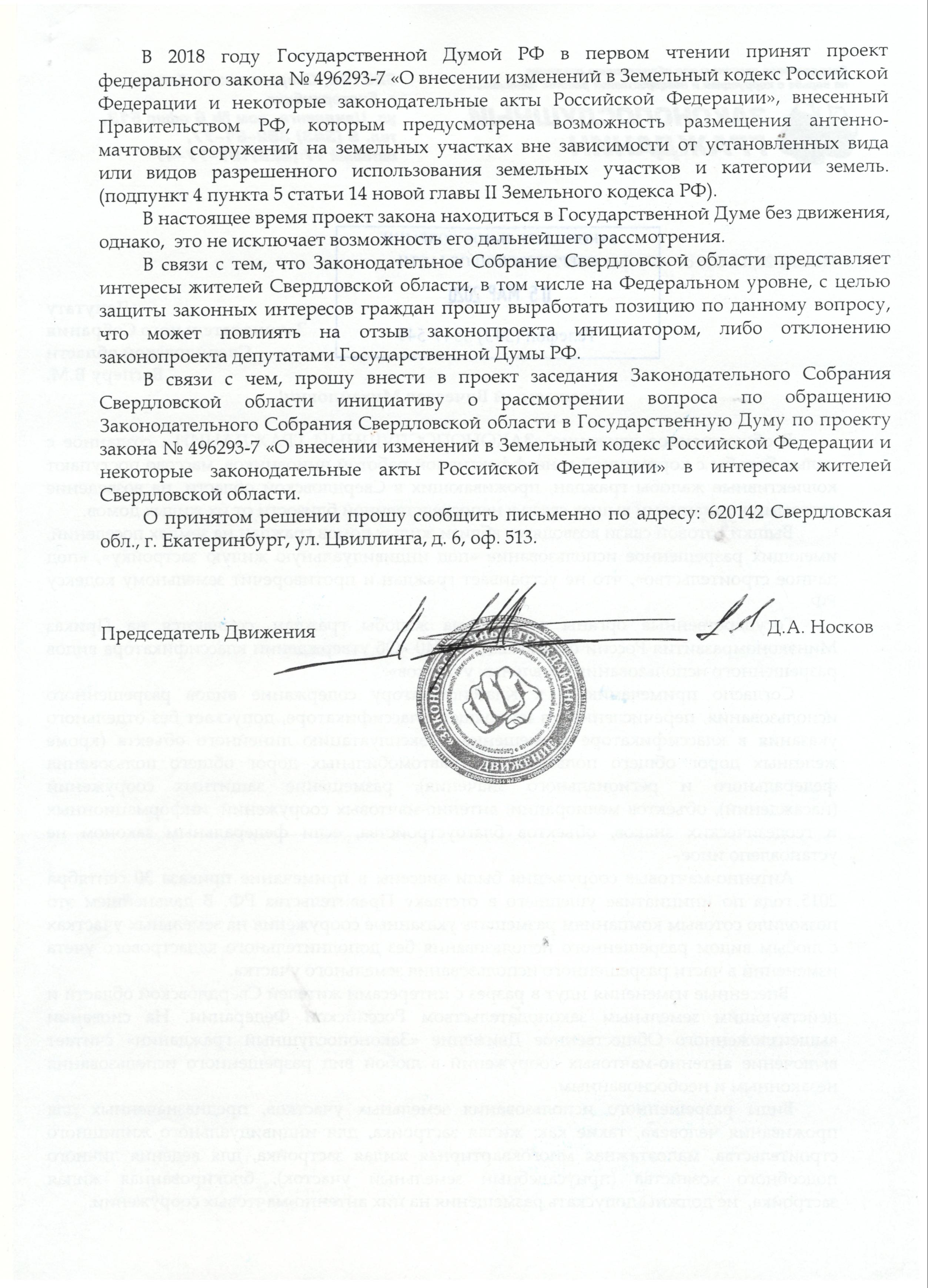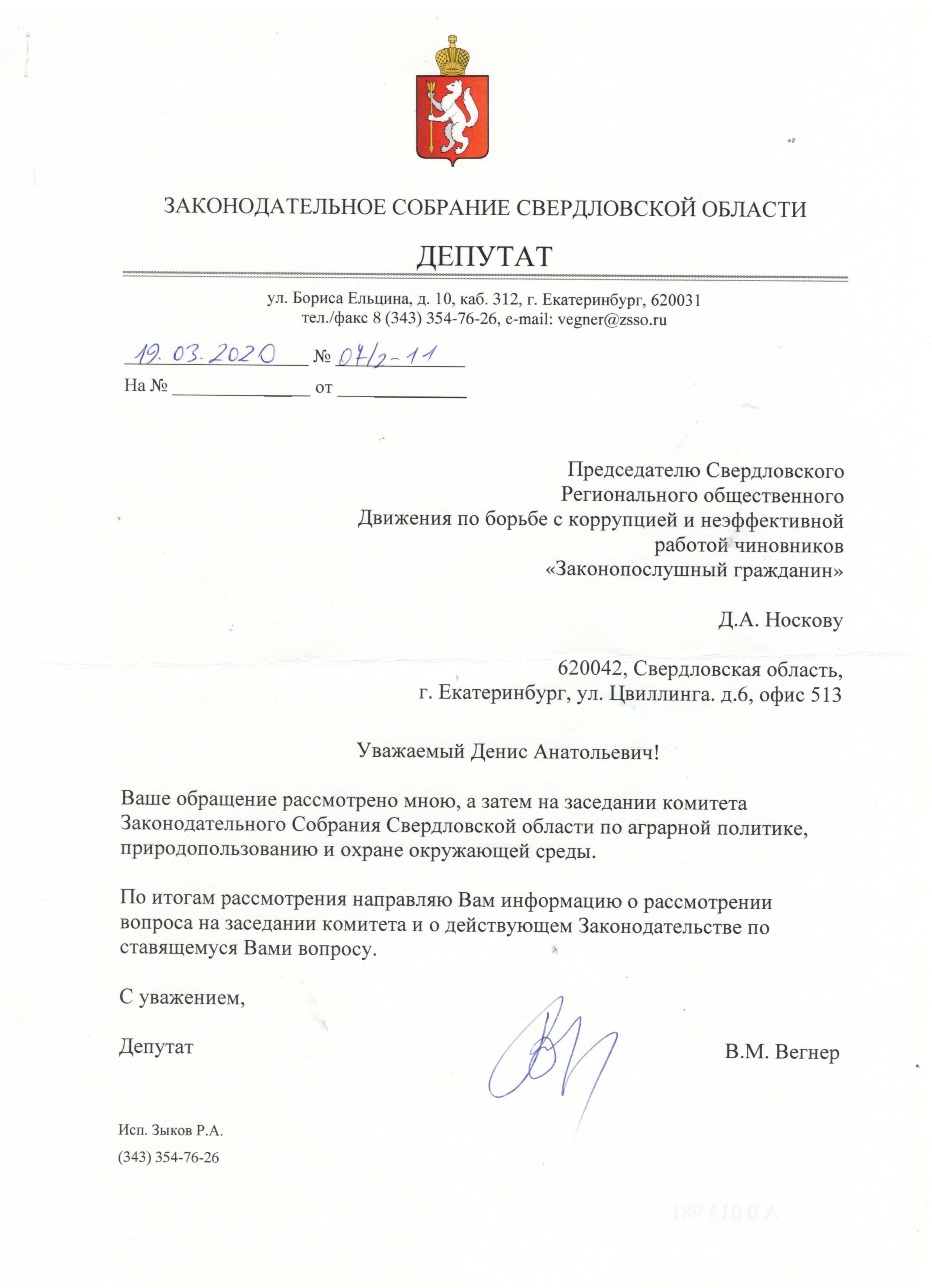 В адрес депутата Законодательного Собрания Свердловской области Вегнера В.М. направлено обращение, с просьбой внести в проект законодательного собрания Свердловской области инициативу о рассмотрении вопроса по обращению Законодательного Собрания Свердловской области в Государственную Думу по проекту закона №496293-7 «О внесении изменений в Земельный кодекс Российской Федерации и некоторые законодательные акты Российской Федерации» в интересах жителей Свердловской области.
