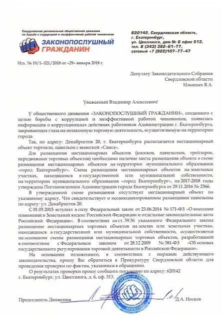 В адрес депутата Законодательного Собрания Свердловской области Ильиных В.А. направлен запрос о незаконном размещении нестационарного объекта торговли с просьбой обратиться в областную прокуратуру.